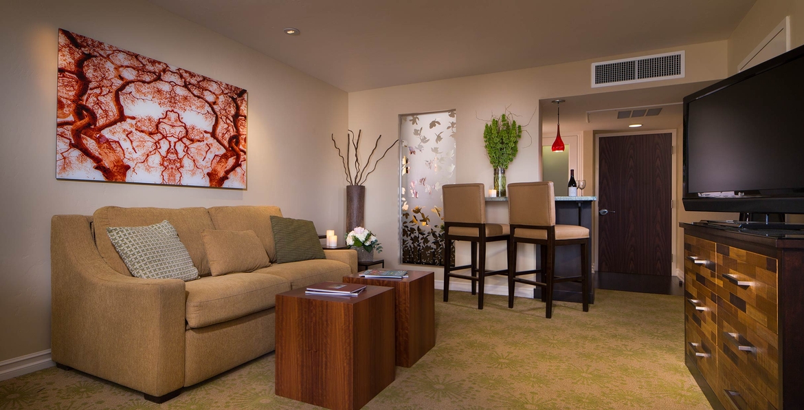 Located on the top floor is a luxurious wine country haven. The Presidential Suite, also known as the Chairman's Suite, provides a spacious and lavish space for everything a premier suite should be and more.