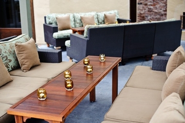The open-air patio of Craft House at Corque is comfortable yet elegant with a large fireplace and modern outdoor furnishings.
